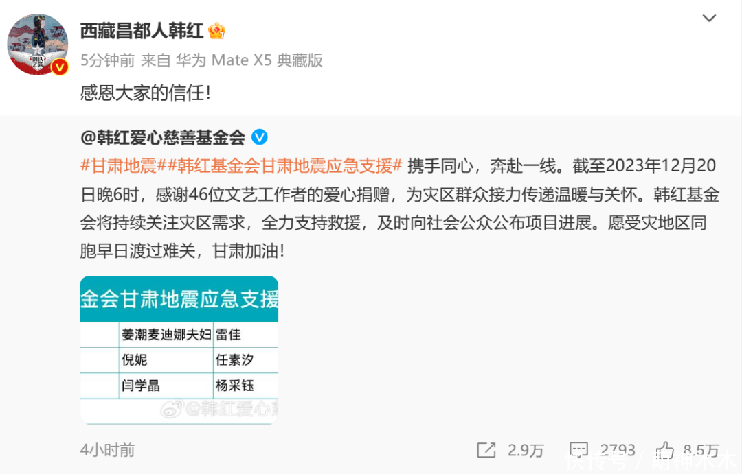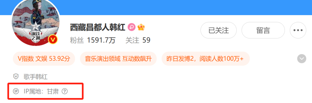 当今,韩红的微博IP仍是酿成了甘肃,阐扬她本东谈主确乎到了一线。而况,在各人的监督下,她会发布微博公布基金会的动态。