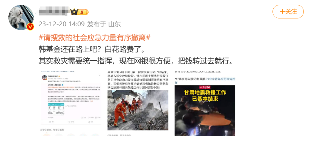在此次救灾行动中,韩红基金会晓谕捐赠的行动相配快,但物质投递工夫相对慢。看官方晓谕社会力量裁撤工夫点,就会发现韩红团队东谈主还没到达灾地,欧博游戏平台东谈主这边仍是命令裁撤了。